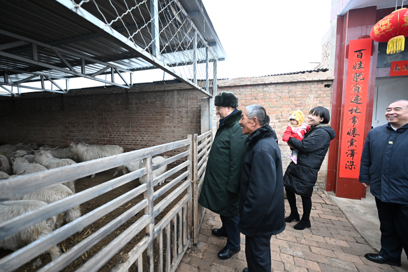1月26日至27日,,,中共中央总书记、国家主席、中央军委主席习近平来到山西,,,探望慰问下层干部群众。。。。这是26日下昼,,,习近平在临汾市汾西县僧念镇段村蔡文明家观察羊圈。。。。新华社记者 李学仁 摄